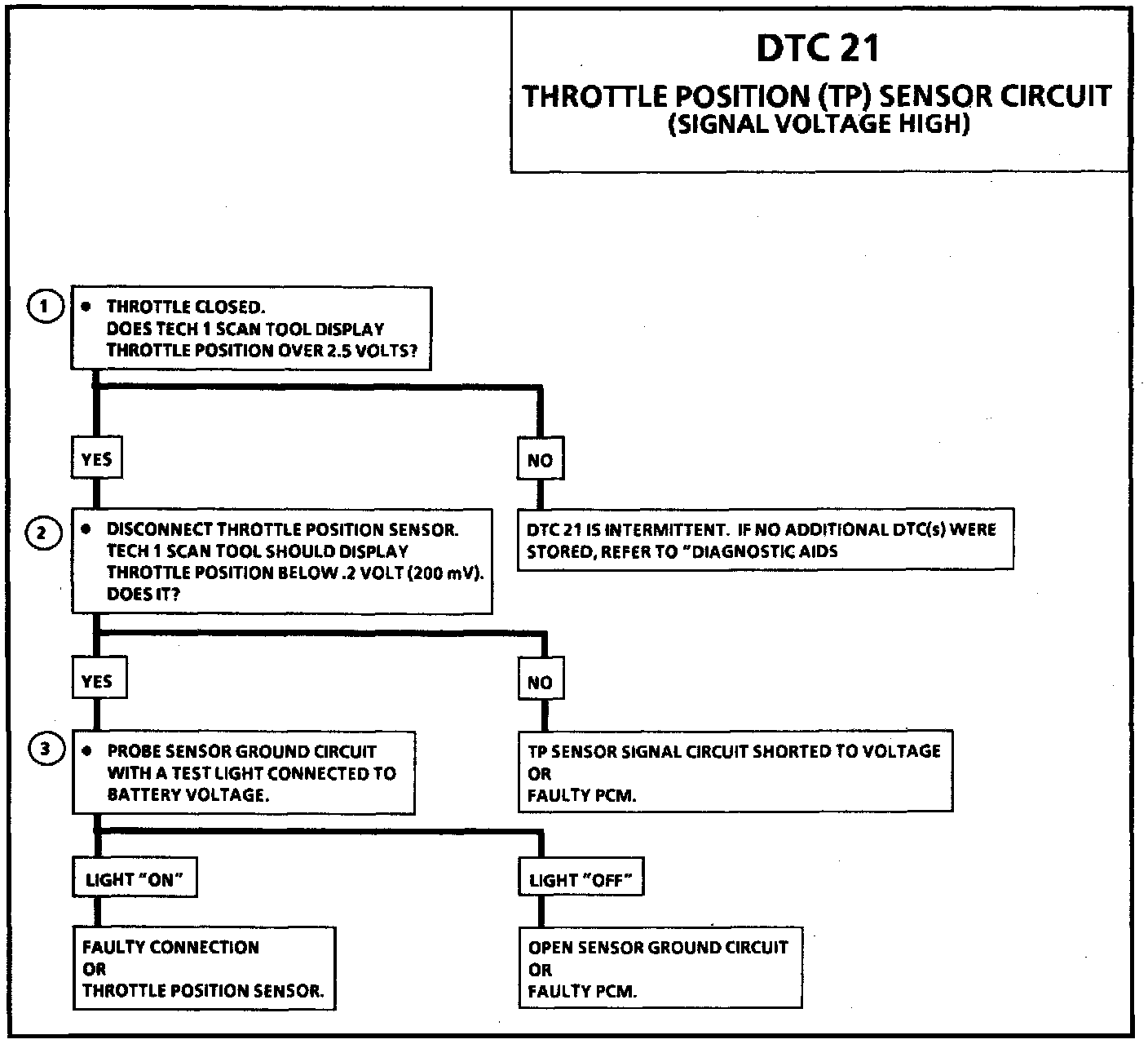 An open in CKT 452 will result in a DTC 21. Scan TP sensor while depressing accelerator pedal with engine stopped and ignition "ON." Display should vary from about .5 volt when throttle was closed, to about 4.8 volts when throttle is held at (WOT) position.