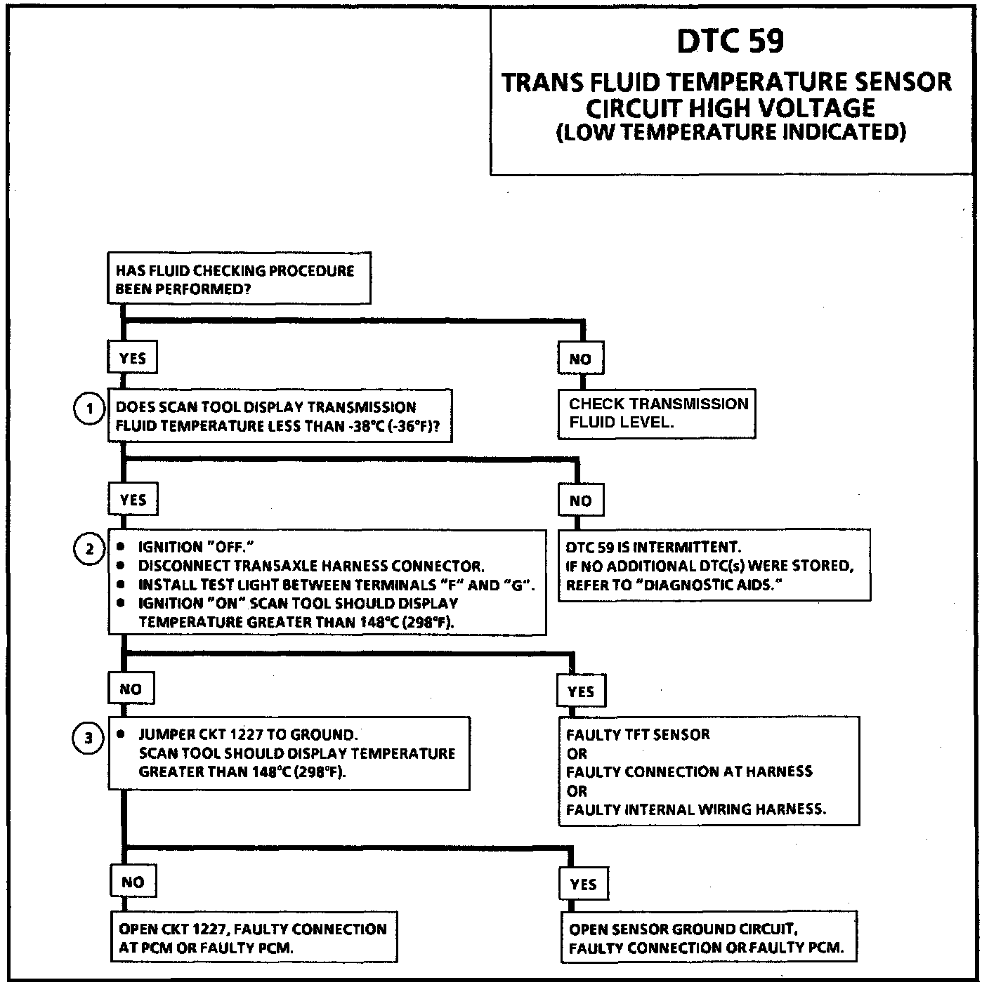 DTC 59 Will Set When: Transaxle fluid temperature is indicated below -40°C for 5 seconds.