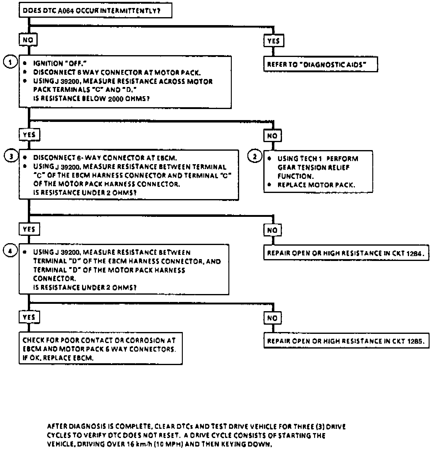 DTC A064 can be set only when the motor is commanded "OFF." If the Electronic Brake Control Module (EBCM) detects an out of range voltage in either of the rear axle motor circuits indicating an open circuit, a malfunction exists.