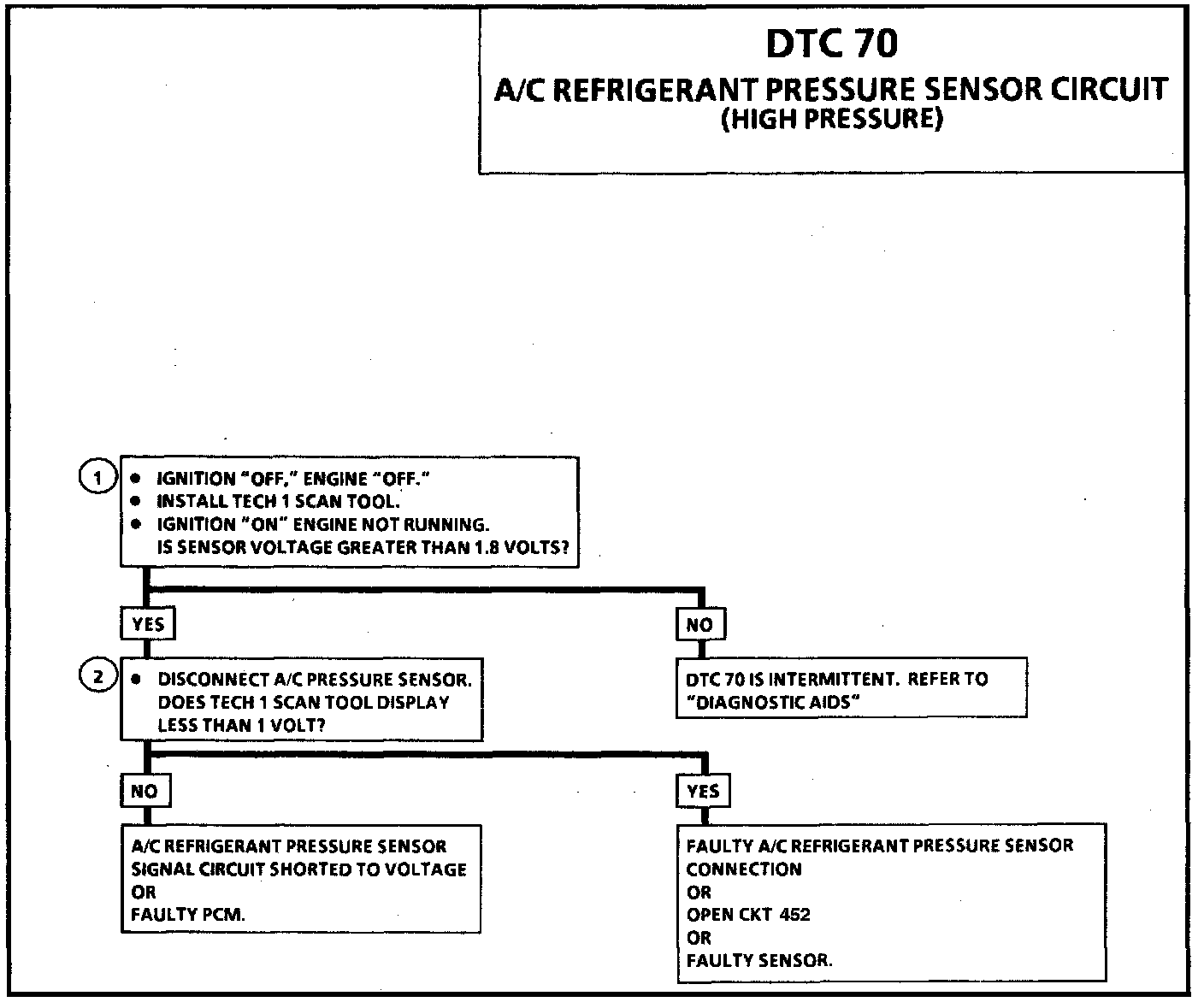 DTC 70 sets when signal voltage falls outside the normal possible range of the sensor and is not due to a refrigerant system problem. If problem is intermittent, check for opens or shorts in harness or poor connections.