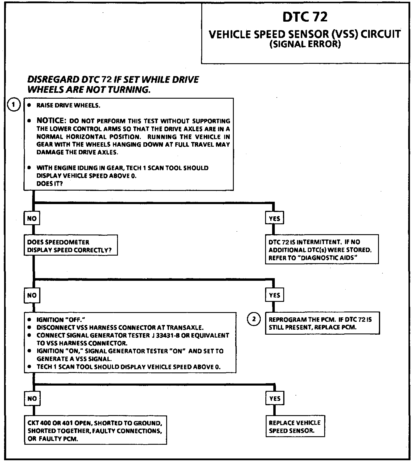 ^ DTC 72 is set when the PCM detects a loss of the VSS signal as the vehicle is moving at road speeds. This would typically indicate a hardware or circuit failure rather than a software or calibration error.