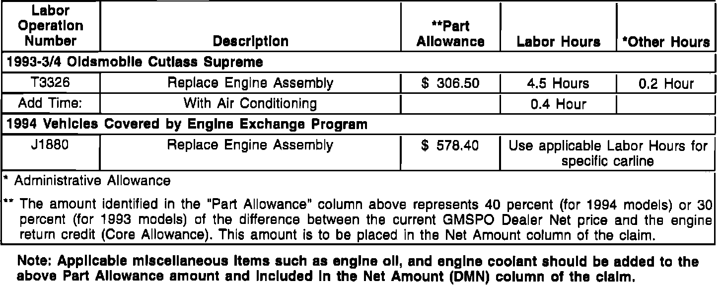 To obtain early product feedback on the new 3100 V6 SFI RPO L82 engine, an exchange program has been approved. This program includes the interim 1993 Oldsmobile W-Car and 1994 A, L, N and W vehicles. To participate in this exchange program, follow the guidelines in this bulletin. This program is in effect through September 1, 1994.
