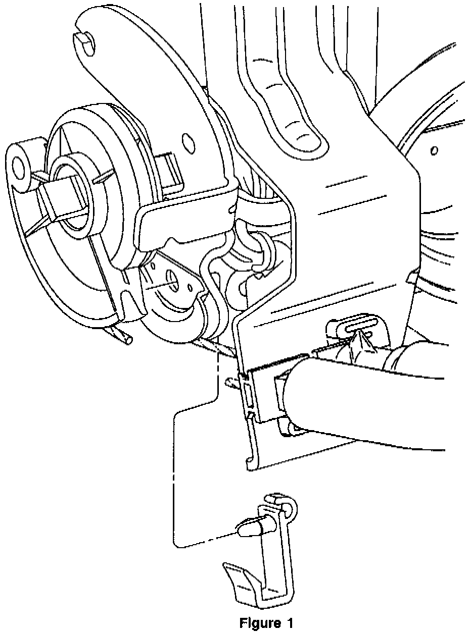 2. Install the throttle clip over the cam groove (Figure 1) in line with the existing hole in the throttle cam thus capturing the accelerator cable in the groove. Rotate the clip upward to insert the clip tang into the throttle cam hole. Rotate the clip downward and push to seat the clip tang in the throttle cam.