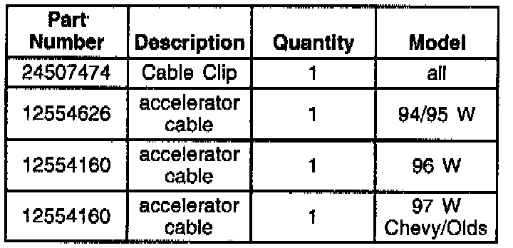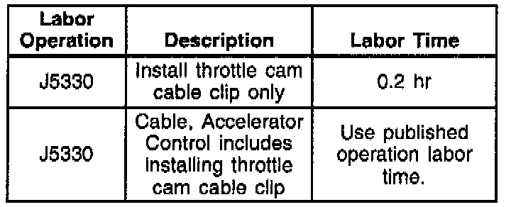 If the accelerator cable is broken or shows any signs of wear on the stranded wire end at the throttle cam, replace the cable and install a cable retention clip. If the cable is not broken and the cable shows no wear on the stranded wire end, install an accelerator cable retention clip. The accelerator cable retention clip can be installed by following the procedure below: