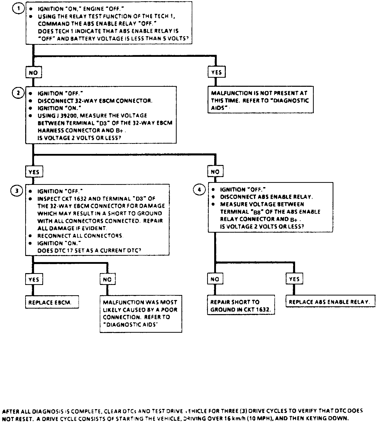 DTC 17 can be set before the EBCM commands the ABS enable relay "ON." This test determines if the ABS enable relay is energized when it should not be. This malfunction would not allow the ABS enable relay to remove power to the ABS system. If a second malfunction were to occur that requires the ABS enable relay to be turned "OFF," that malfunction cannot be removed if the relay cannot be controlled.