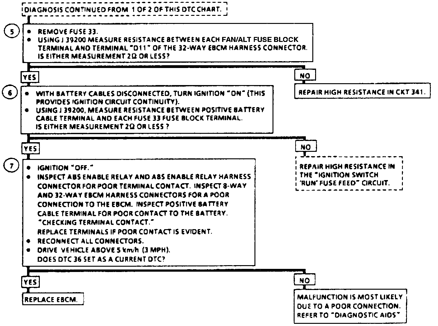 DTC 36 can only be set if the vehicle's speed is greater than 5 km/h (3 mph). If the switched battery voltage is less than 11.2 volts non-ABS or less than 9.6 volts ABS, a malfunction exists.