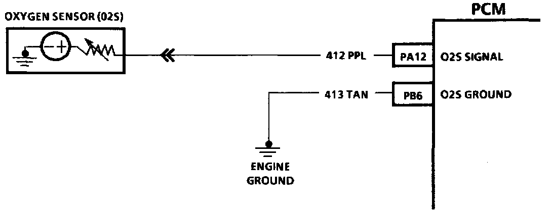 The Powertrain Control Module (PCM) supplies a voltage of about .45 volt between terminals "PA12" and "PB6". (If measured with a 10 megohm digital voltmeter, this may read as low as .32 volt.) The Oxygen Sensor (O2S) varies the voltage within a range of about 1 volt if the exhaust is rich, down through about .10 volt if exhaust is lean.