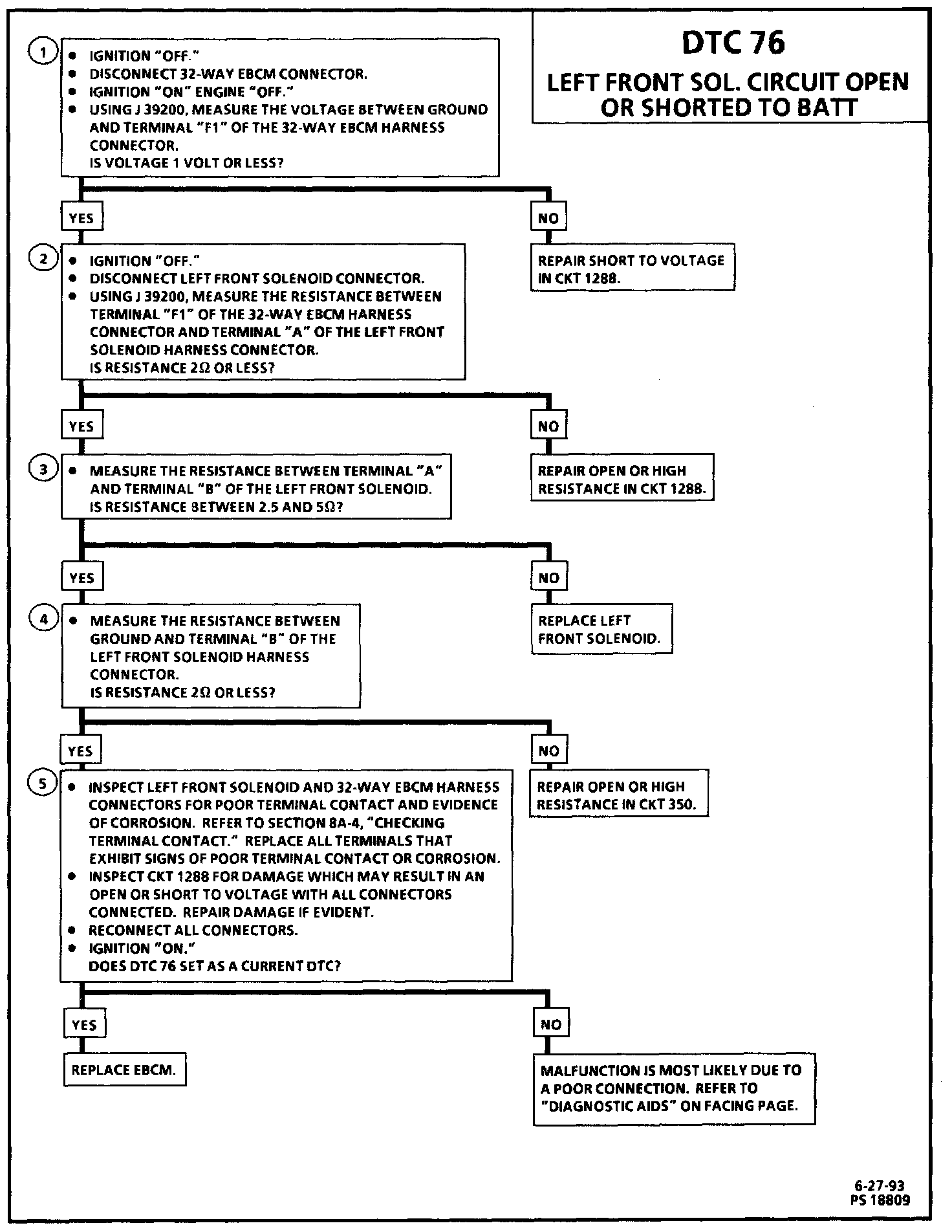DTC 76 can be set only when the solenoid is commanded "OFF." If the EBCM detects an excessive voltage in the left front solenoid control circuit, a malfunction exists.