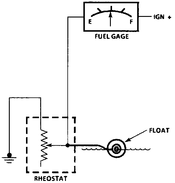 The fuel sender consists of the float, wire float arm, rheostat and the roll-over valve. Fuel level is sensed by the position of the float and float arm which operate the 90 ohm rheostat. As the float position changes, the amount of current passing through the rheostat varies, thus changing the gage reading on the instrument panel.