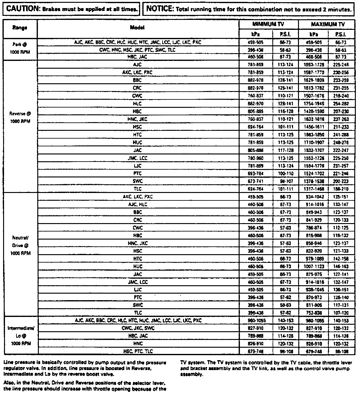 7. To check full throttle valve line pressure, tie or hold the TV to the full extent of its travel, then with brakes applied, transaxle in range specified and engine at specified speed, check pressures also according to the chart.