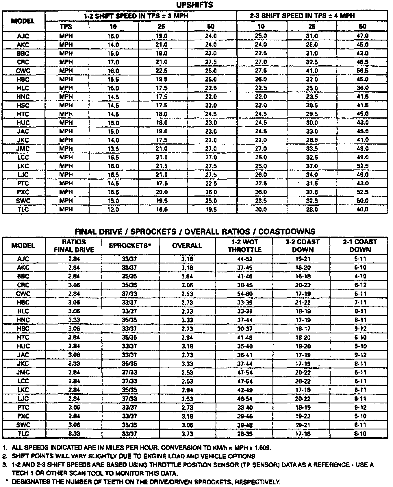 10. With gear selector in Drive, accelerate until vehicle shifts into 3rd gear and TCC is applied.Release accelerator and lightly apply brake. The TCC should release, then note downshift speed points and compare results with speed points shown in the figures.