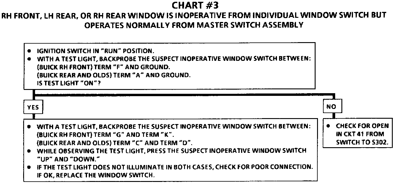 Chart #3 RH Front, LH Rear/RH Rear Window Is Inoperative From Individual Window Switch But Operates Normally From Master Switch Assembly:
