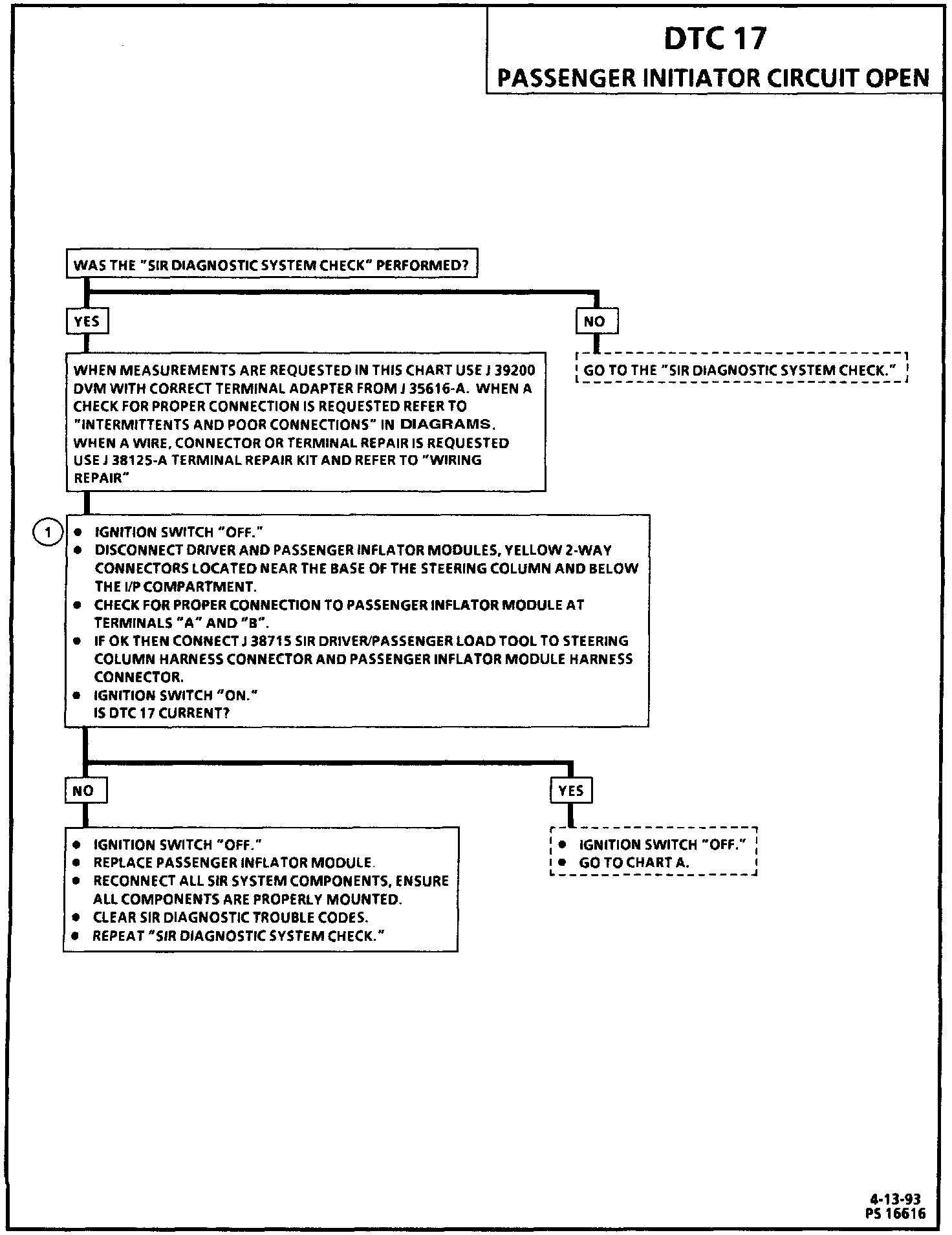 When there is an open in the passenger inflator module the resistance between "Passenger Side High" terminal "A7" and "Passenger Side Low" terminal "B7" increases. This causes a larger voltage drop from the "Passenger Side High" to the "Passenger Side Low" across a resistor inside the DERM which connects these two terminals together. The increase in the voltage difference between "Passenger Side High" and "Passenger Side Low" is detected by the DERM during the "Continuous Monitoring" tests and DTC 17 is set.