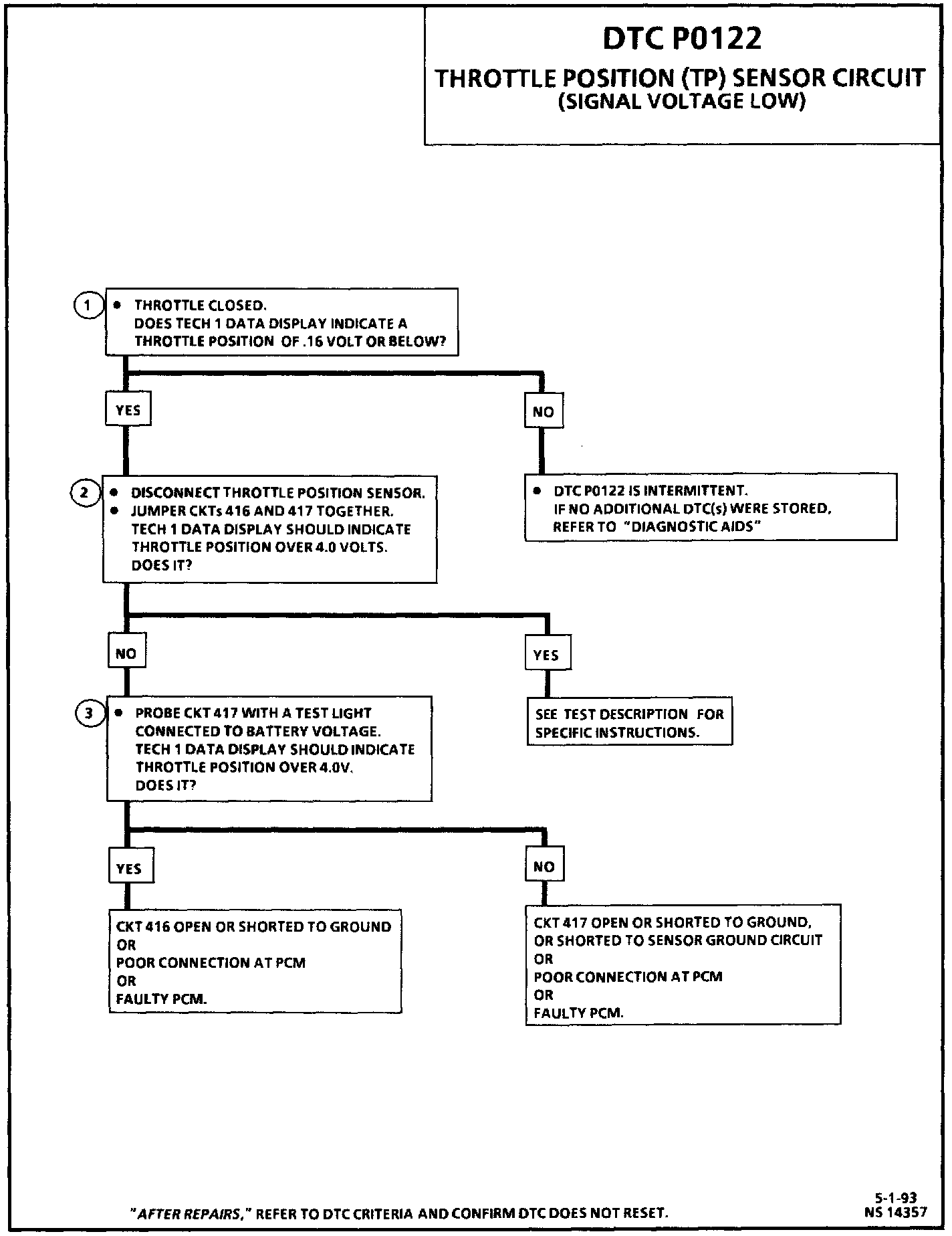 An open or short to ground in CKT 416 or 417 will result in DTC P0122.