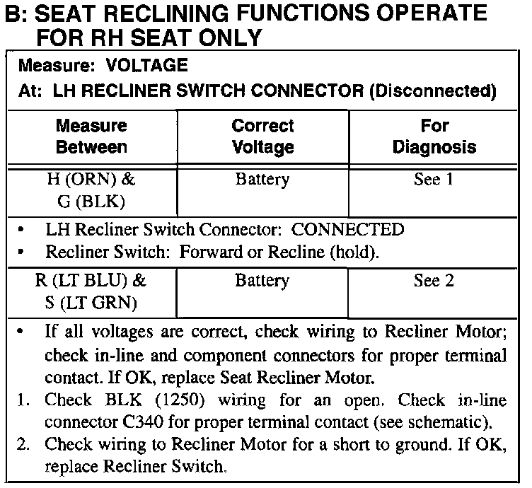 B: Seat Reclining Functions Operate For RH Seat Only: