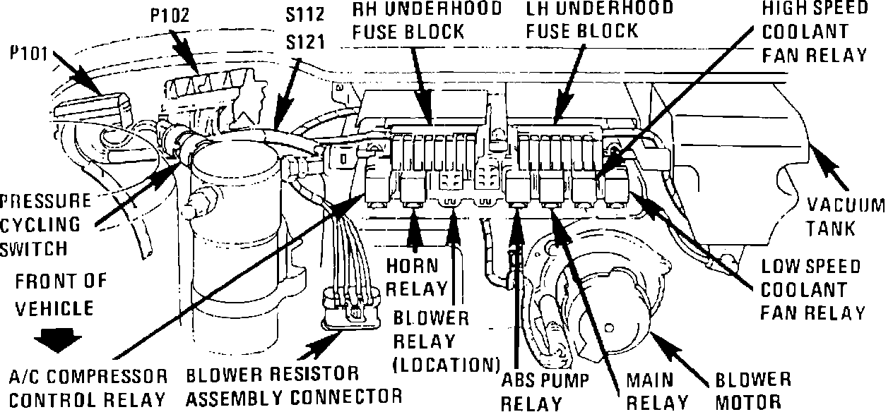 The A/C relay is located in the right hand underhood fuse block.