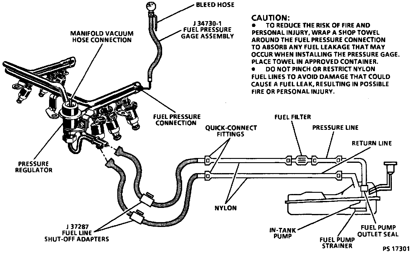 An electric fuel pump, attached to the fuel sender assembly (inside the fuel tank) supplies fuel through an in-line filter to the fuel rail assembly. The pump is designed to provide sufficient fuel flow for all engine requirements. A pressure regulator, attached to the fuel rail, keeps fuel available to the injectors at a regulated pressure. Unused fuel is returned to the fuel tank by a separate line.