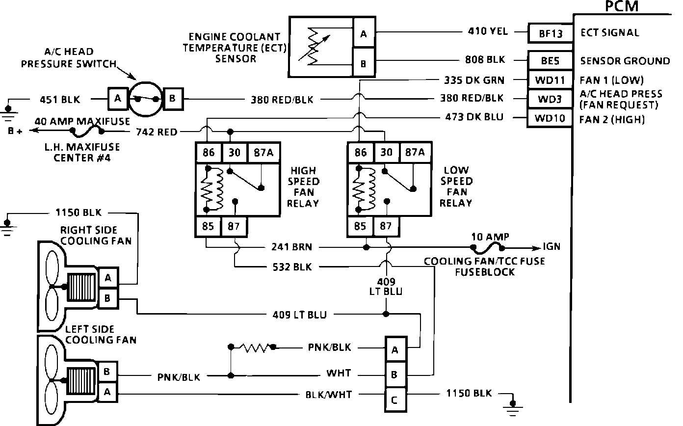 Electronic cooling fans operate when engine coolant temperature exceeds a certain value. The PCM completes the ground paths for the windings of the cooling fan relays. The relay contacts then close and complete the circuit between the 60 amp maxifuse and the fan motor. When the engine cools down, the PCM removes the ground for the fan relays and the fans stop.