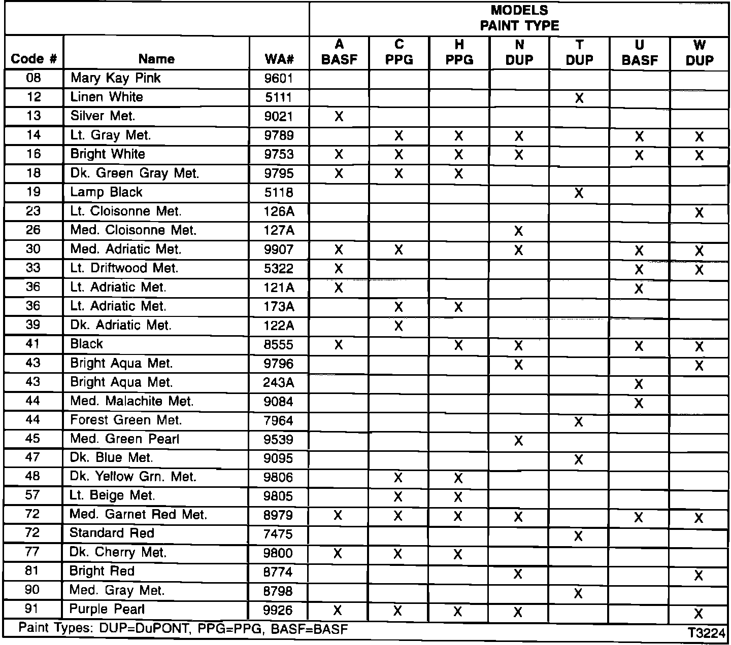 Paint - Exterior Color Code & Cross Reference