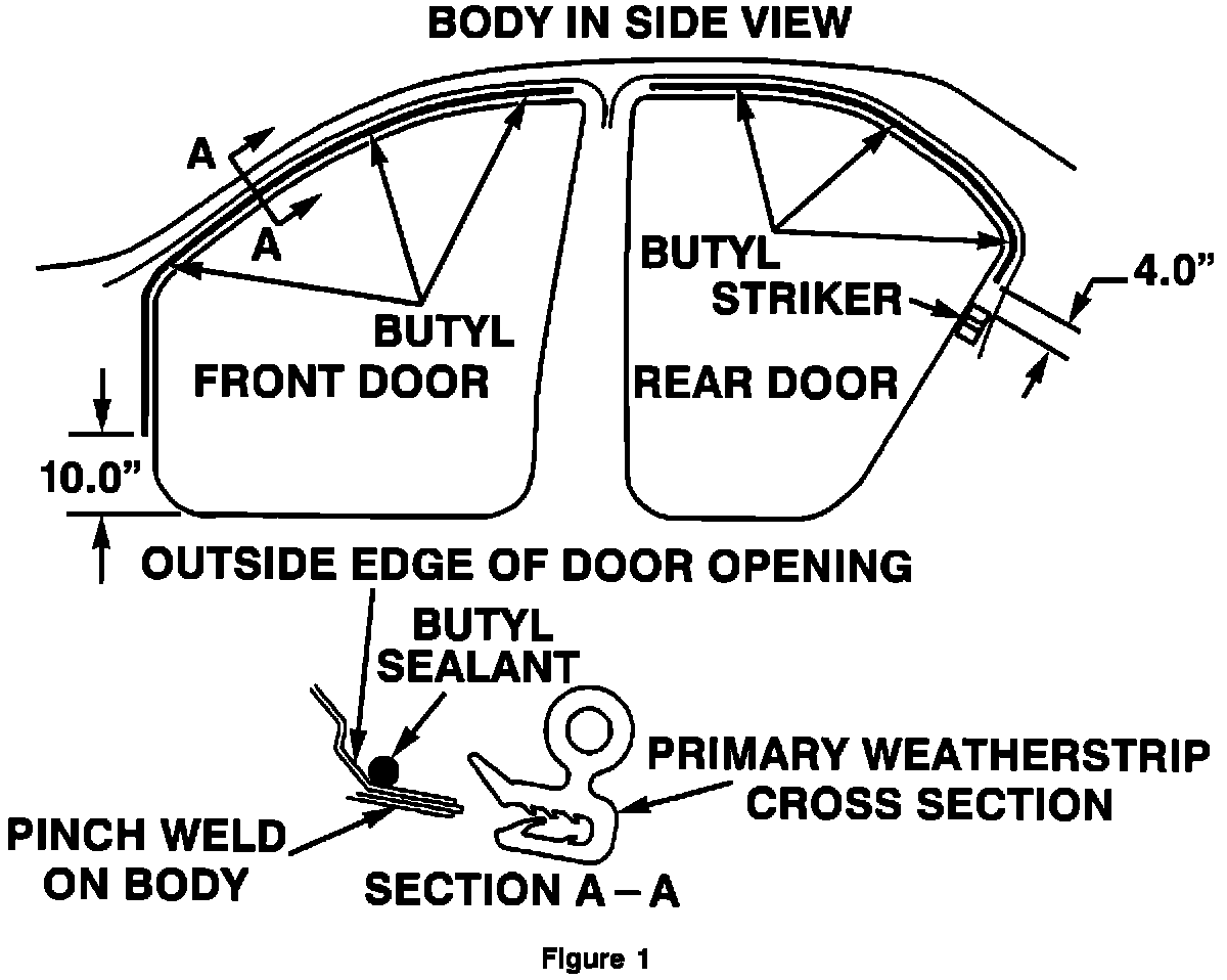 3. Apply butyl sealant to front door opening flange starting at the top of the center pillar (Figure 1). Run butyl forward along top of door opening and down front of opening to approximately 10 inches from bottom of door opening.