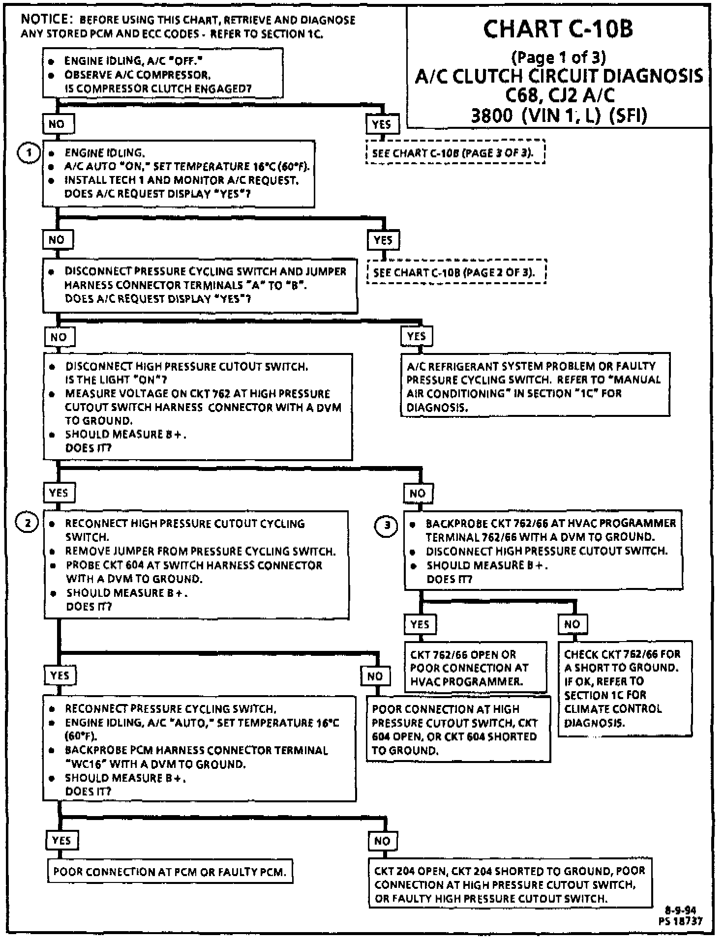 The Revised Charts specify the use of a DVM (J 39200) instead of a test light to check the A/C request circuitry between the A/C controls and the PCM. Use of the DVM for this purpose is necessary due to the low current supplied to the A/C request line by some systems.