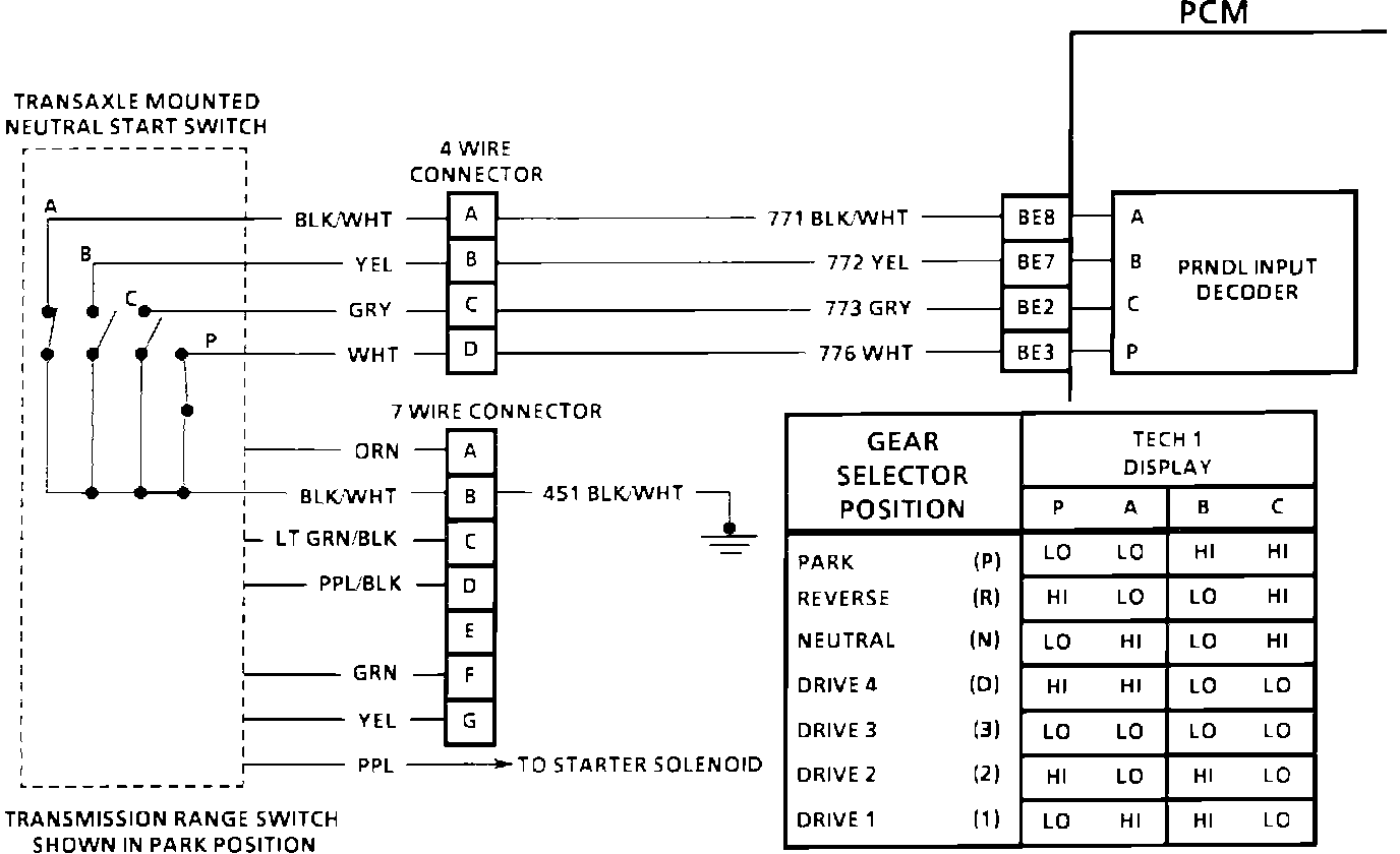 The PRNDL input consists of 4 discrete circuits to pull 4 PCM voltages low in various combinations to indicate each gear range. The voltage level of each of the circuits is represented as low = grounded circuit and high = open circuit.