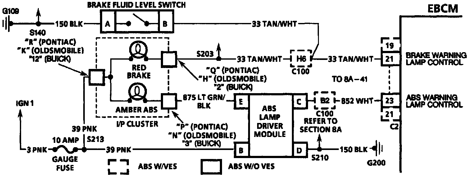 This test checks the state of the ABS warning lamp to identify a situation in which the driver could not be warned of a system malfunction by the ABS warning lamp, or the warning lamp is always "ON." The Lamp Driver Module (LDM) turns the ABS warning lamp "ON," unless the EBCM provides ground to turn it "OFF." Because of the circuitry in the LDM, only external malfunctions can be detected. As a result, the ABS warning lamp itself is not diagnosable, only the control line to the EBCM can be diagnosed. In the event of an open CKT 852, the ABS warning lamp will be "ON" at all times, due to the loss of ground at the LDM input. If the control line is shorted to ground, the ABS warning lamp is kept "OFF," due to the LDM input being grounded. If the control line is shorted to B+, the EBCM cannot command the ABS warning lamp "OFF."