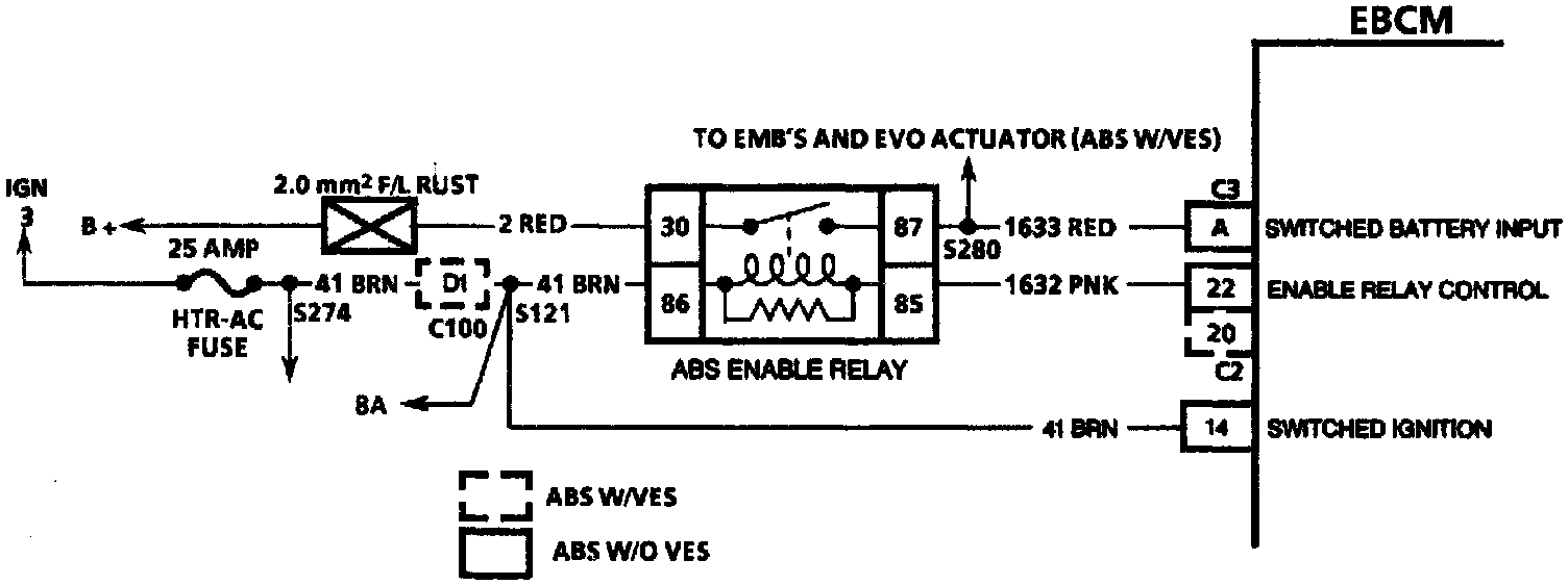 Ignition voltage is supplied through terminal "86" of the ABS enable relay. The EBCM is then able to energize the pull-in coil by completing the ground circuit at EBCM terminal "22" (ABS w/o VES) or "20" (ABS w/VES). The magnetic field created closes the enable relay contacts and allows battery voltage and current to be supplied to the EMB's, EVO actuator (ABS w/VES), and EBCM, which supplies power to the motors and solenoids.