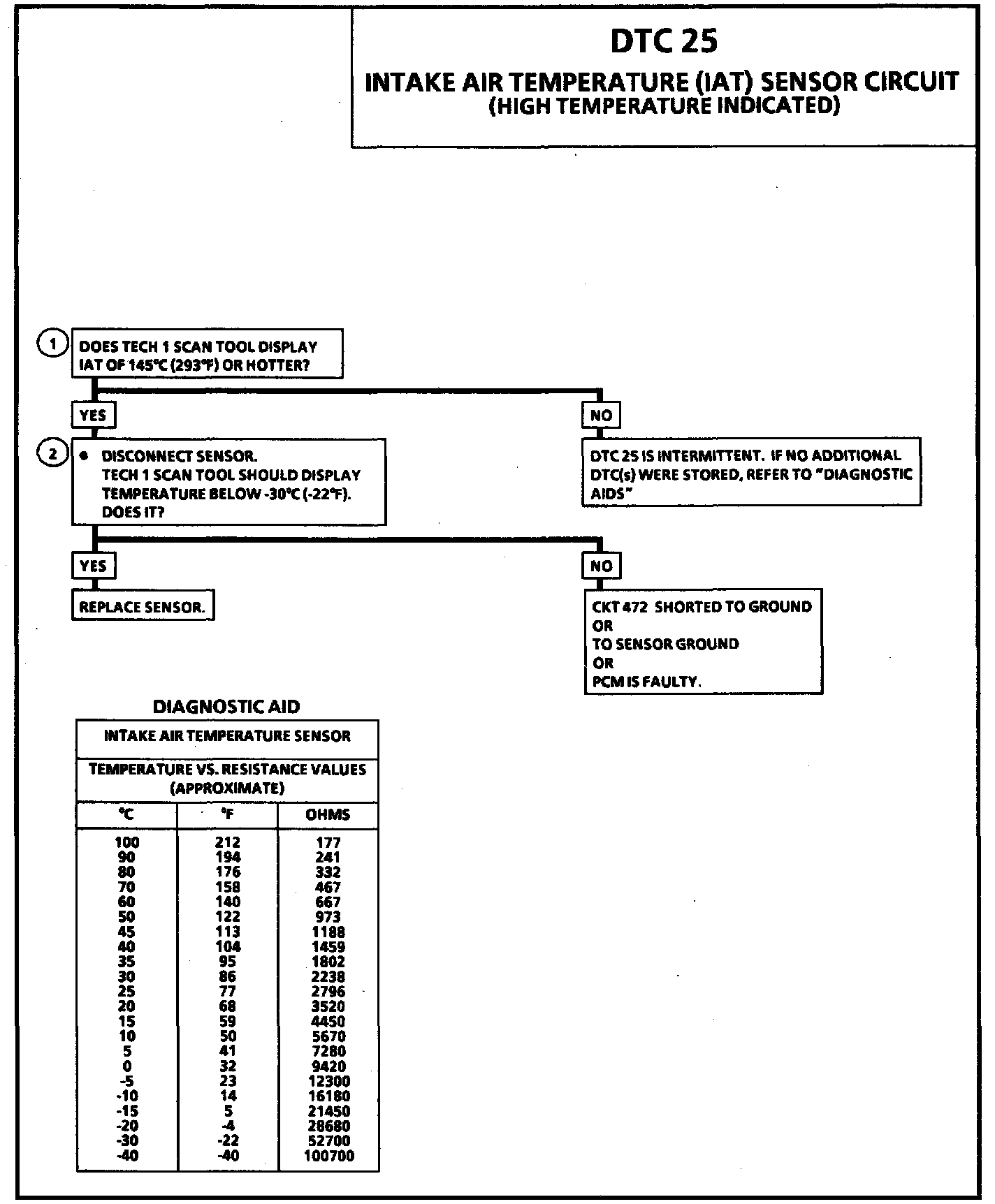 The "Temperature to Resistance Values" scale in the chart may be used to test the IAT sensor at various temperature levels to evaluate the possibility of a "shifted" (mis-scaled) sensor. A "slewed" sensor could result in poor driveability complaints.