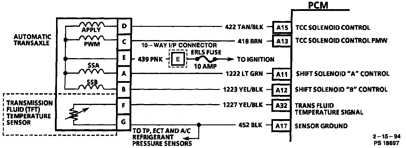 The Transmission Fluid Temperature (TFT) sensor is a 2 wire thermistor located in the transaxle. This sensor operates in the same way as an Engine Coolant Temperature (ECT) or Intake Air Temperature (IAT) sensor. The Powertrain Control Module (PCM) applies 5 volts to the sensor on circuit 1227. The voltage sensed at PCM pin "A32" will be high when the trans fluid is cold, and as the trans fluid warms the voltage signal will drop. A very low signal voltage therefore indicates a high fluid temperature or a failure in the sensor circuit. Normal fluid temperatures range between 75° C (167° F) and 100° C (212° F).