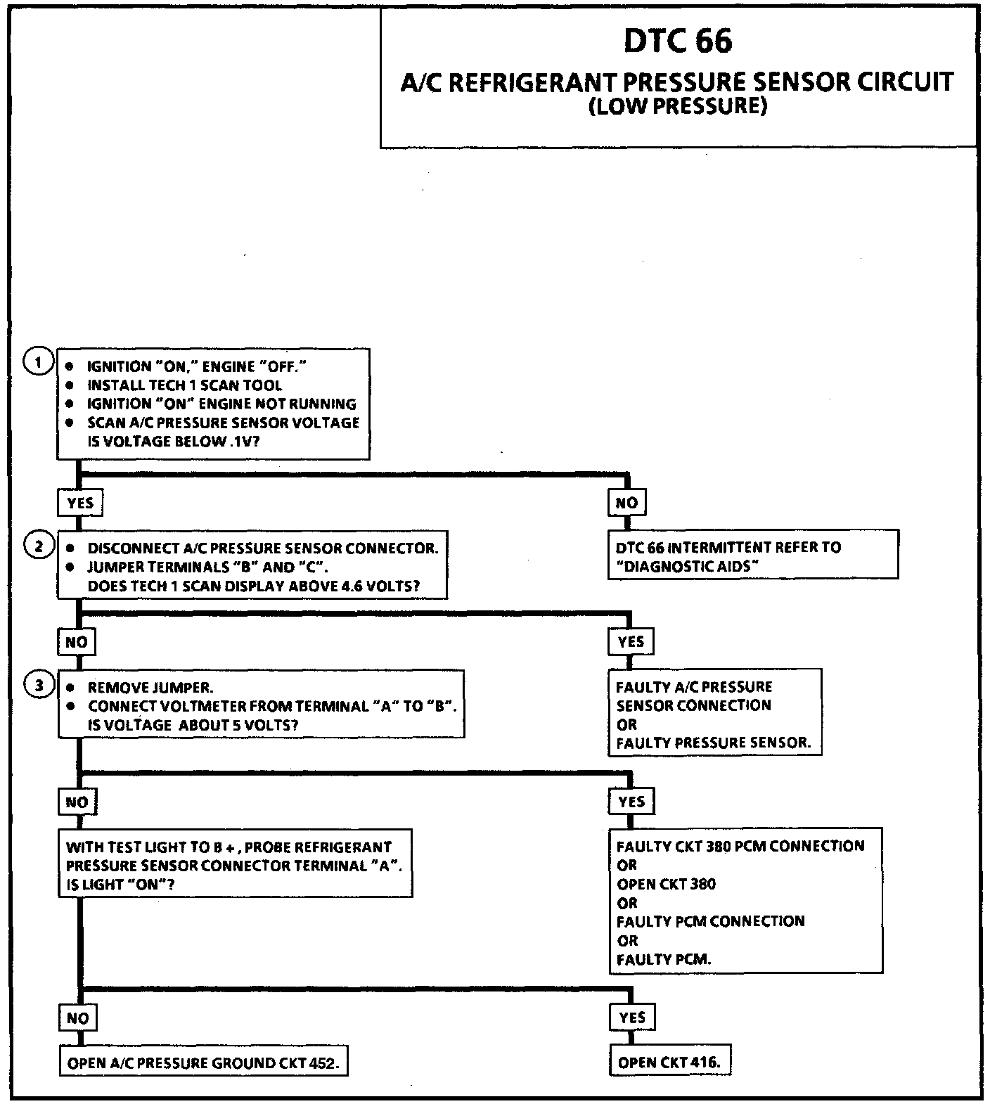 DTC 66 sets when signal voltage falls outside the normal possible range of the sensor and is not due to a refrigerant system problem. If the problem is intermittent, check for opens or shorts in harness or poor connections.