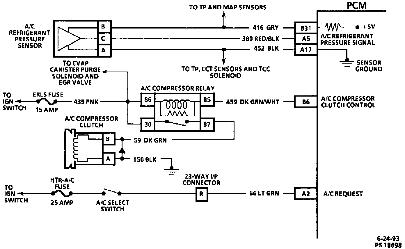 When pressure is low, a low signal voltage is sensed at the PCM. As pressure rises, the voltage increases at PCM terminal "A5" which is translated by the PCM into rising pressure. If the signal voltage remains below a calibrated value, a Diagnostic Trouble Code (DTC) 66 is set which indicates a sensor or circuit failure.