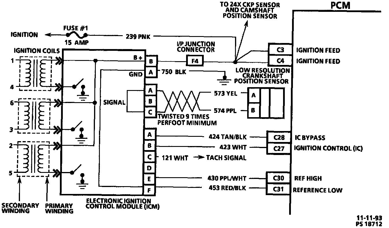 ^ It sends a "3X crankshaft reference" (fuel control) signal to the PCM. The PCM determines engine RPM from this signal. It is also used by the Powertrain Control module (PCM) to determine crankshaft position for ignition control spark advance calculations. The signal sent to the PCM by the ICM is an "ON-OFF' pulse occurring 3 times per crankshaft revolution.