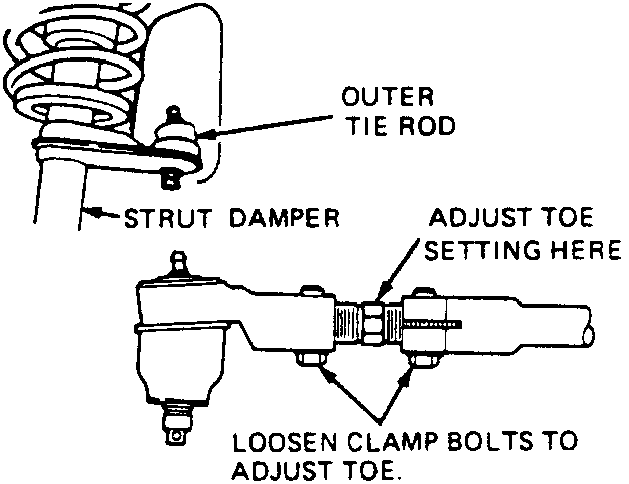 Toe, Fig.1 , is controlled by tie rod position. Adjustment is made by loosening the clamp bolts at the steering knuckle end of the tie rods and rotating the rods to obtain proper toe setting, Fig.3 . After correct toe setting is obtained, torque clamp bolts to 41 ft. lbs.