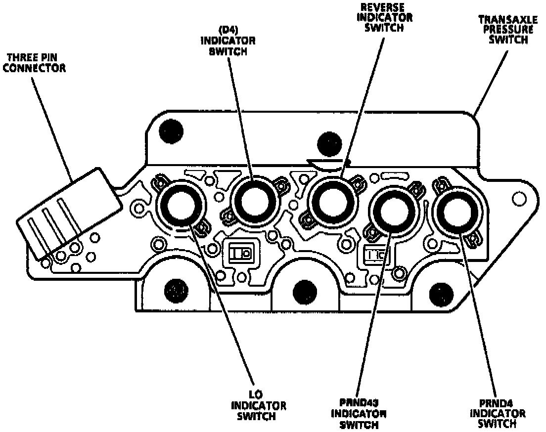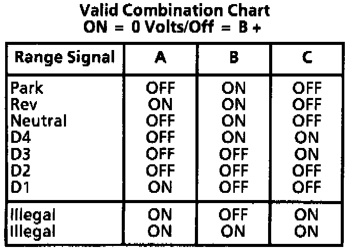 This device is a set of five normally open pressure switches, that detect fluid pressure within the control valve assembly passages. The five pressure switches are connected to three signal circuits referred to as range signals A, B, C. The combination of pressure switch states determine the voltage signal (B + or 0) on each range signal to the PCM. These three range signals are then interpreted by the PCM to indicate the transaxle range selected. The transaxle pressure switch assembly is attached to the control valve assembly within the transaxle.