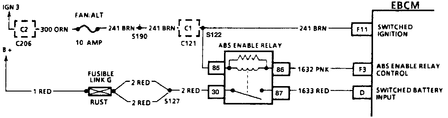 Ignition voltage is supplied through terminal "C1O" of the ABS enable relay. The EBCM then is able to energize the pull-in coil by completing the ground circuit at terminal "D3" of the EBCM. The magnetic field created closes the ABS enable relay contacts and allows battery voltage and current to be supplied to the EBCM, which supplies voltage to the motors and solenoids.