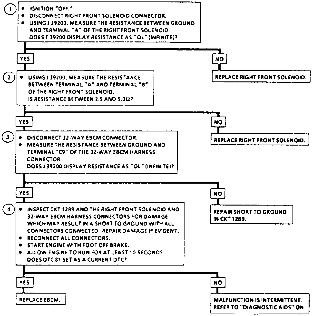 DTC 81 can be set only when the solenoid is commanded "ON." If the EBCM detects the right front solenoid control circuit voltage is out of specification, a malfunction exists.