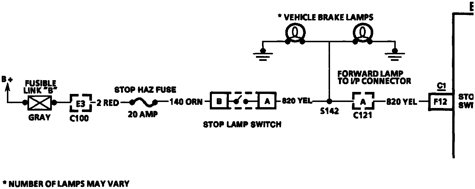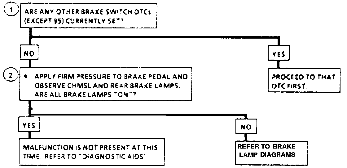 This DTC is designed to isolate the cause of a DTC 95 malfunction and indicate to the driver ABS is still available. If DTC 95 occurs with DTC 96, the brake lamps are open, the brake lamp grounds are open, or the Center High Mounted Stop Lamp (CHMSL) circuit is open during 4-way flasher use. The presence of battery voltage at the brake switch input indicates a valid brake switch input is still available.