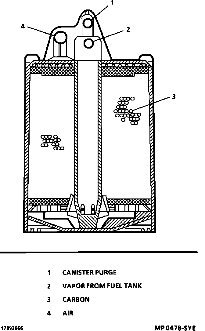 The basic Evaporative Emission (EVAP) control system used on all vehicles is the charcoal canister storage method. This method transfers fuel vapor from the fuel tank to an activated carbon (charcoal) storage device (canister) to hold the vapors when the vehicle is not operating. When the engine is running the fuel vapor is purged from the carbon element by intake air flow and consumed in the normal combustion process.