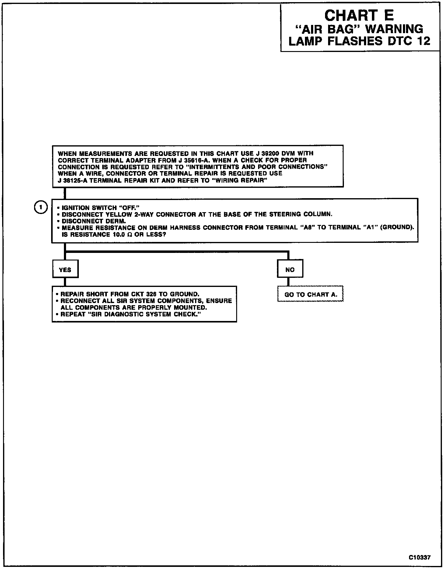 This chart diagnoses the situation where, after BULB TEST (6 or 7 flashes), the "AIR BAG" warning lamp is "OFF" for one second and then begins to flash. The sequence is as follows: the lamp will flash once, pause for one second, then flash twice. After a three second pause the previous sequence may repeat or a new pattern may occur. This condition will continue as long as the ignition switch is "ON."