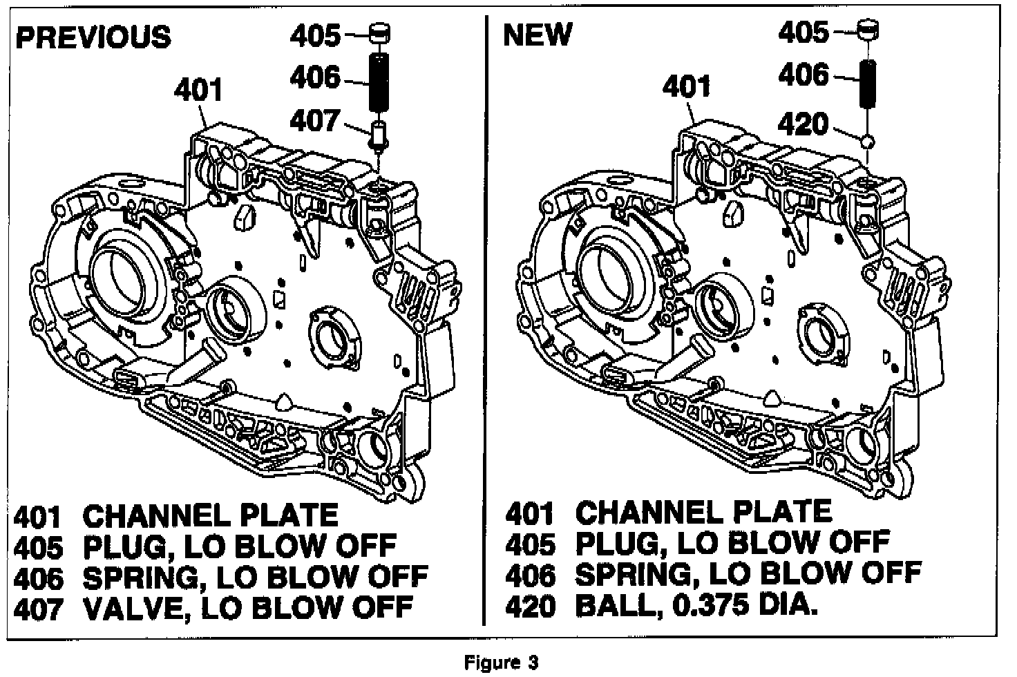 This product update was implemented in production on all 1995 4T60-E models on October 3, 1994 (Julian Date 276). Refer to Figure 3 for identification of the low blow-off design changes. The spacer plate change is not readily apparent. The best way to identify the spacer plate is to determine which channel plate was used with it. Replace the spacer plate it there is any question as to whether it is the previous or new design.