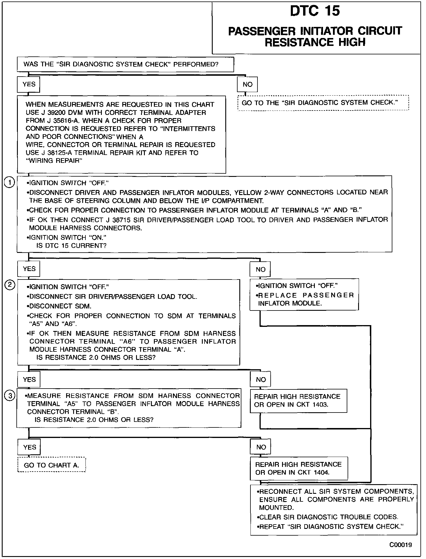An intermittent condition is likely to be caused by a poor connection at the passenger inflator module harness connector terminals "A" and "B," SDM terminals "A6" and "A6," or a poor wire to terminal connection in CKT 1403 or CKT 1404. This test for this diagnostic trouble code is only run while the "AIR BAG" warning lamp is performing the bulb check, unless DTC 17 or DTC 26 is detected. When a scan tool "Clear Codes" command is issued and the malfunction is still present, the DTC will not reappear until the next ignition cycle.