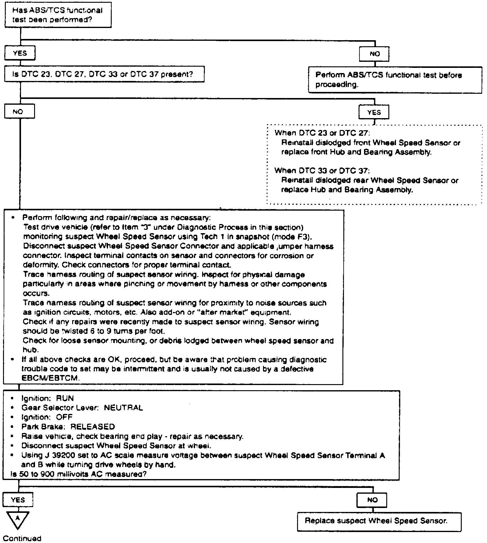 DTC 23, DTC 27, DTC 33, or DTC 37 sets when the EBCM/EBTCM does not see any wheel speed sensor signal, but determines continuity exists in the circuit. This is cause by a dislodged wheel speed sensor, missing toothed sensor ring (front) or defective hub and bearing assembly (rear).