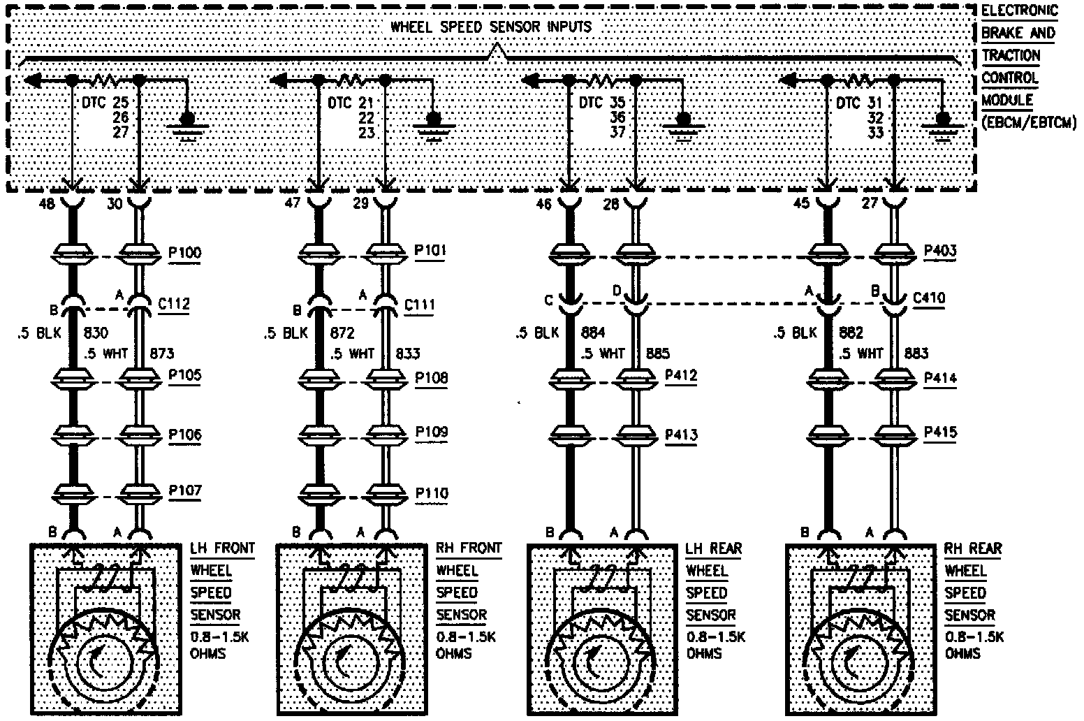 In order to prevent electromagnetic interference from disturbing the wheel speed sensor signal, the cables from the EBCM/EBTCM to each wheel speed sensor are twisted in pairs a minimum of 6 to 9 turns per foot.