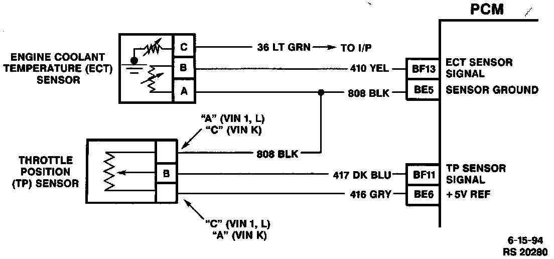 2. With the Throttle Position (TP) sensor disconnected, the TP sensor voltage should go low and a DTC P0122 will set. This test verifies that the PCM and wiring are OK.