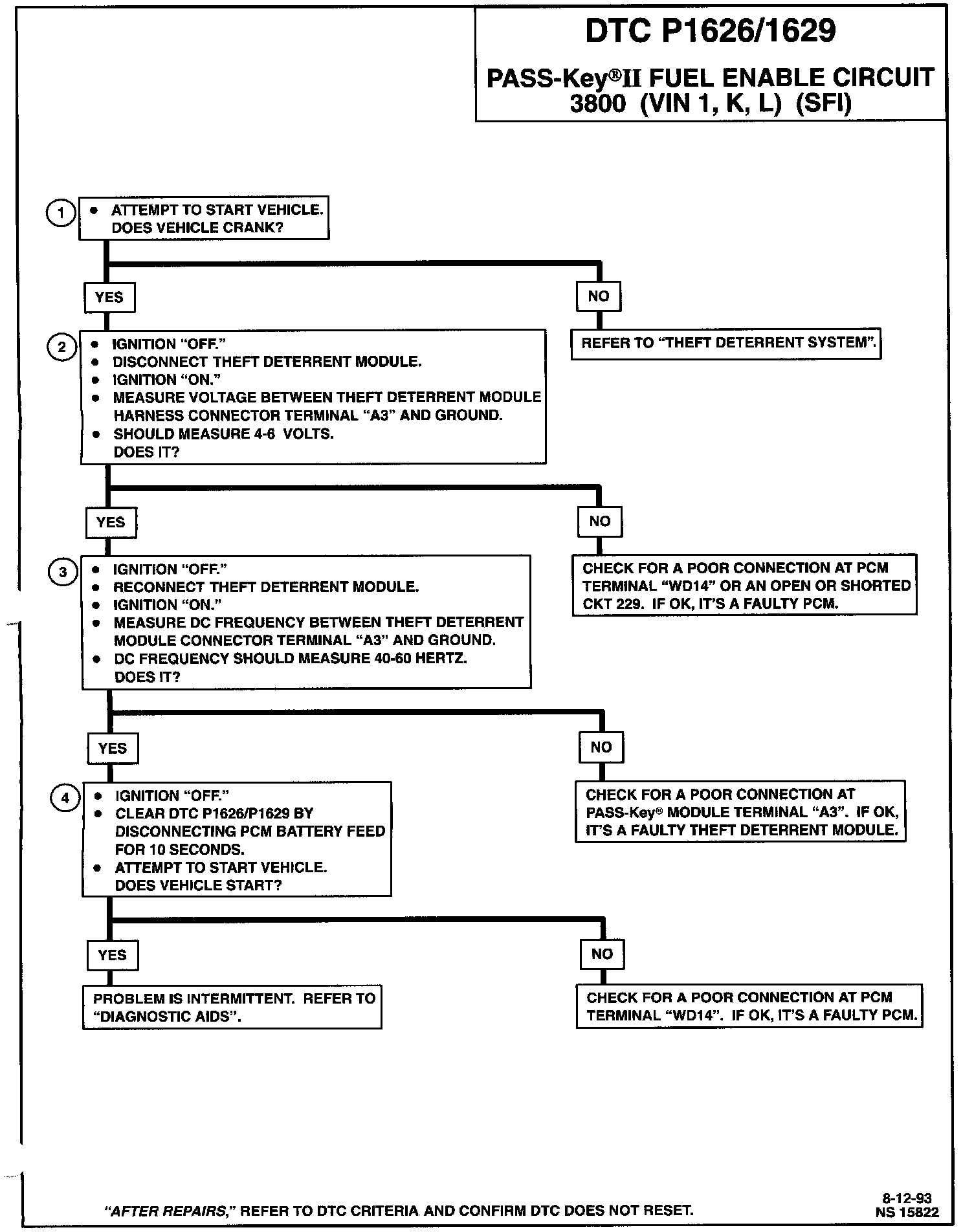 1. If vehicle will not crank with DTC P1626 or P1629 stored, the problem affects the entire theft deterrent system and is not isolated to the fuel enable circuit. Refer to "Theft Deterrent Systems Diagnosis," when diagnosing DTC P1626 or P1629 accompanied by a no-crank.
