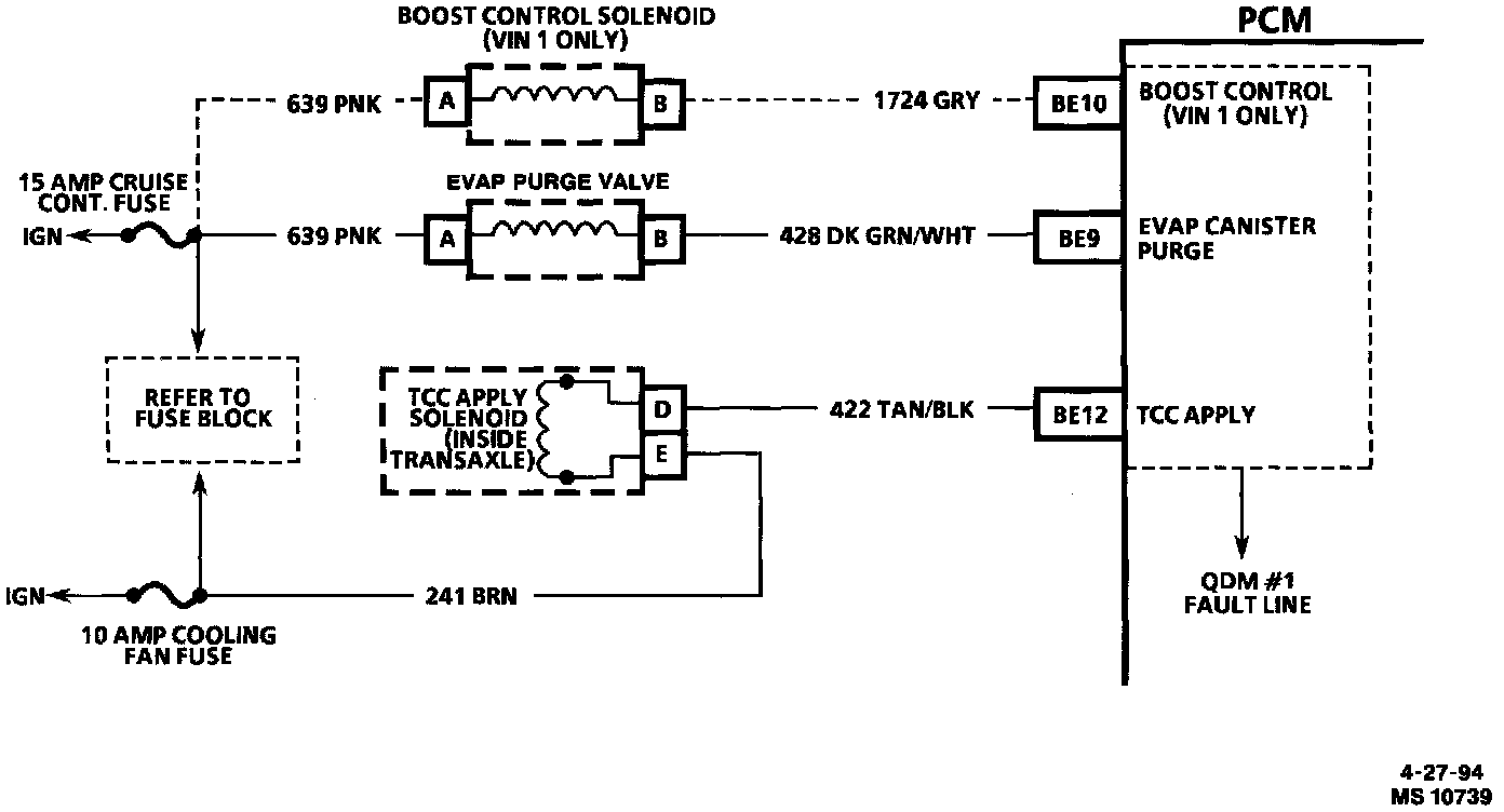 The Powertrain Control Module (PCM) is used to control several components such as Boost Control Solenoid, the Evaporative Purge Valve and the Torque Converter Clutch Apply Solenoid. The PCM controls these devices through the use of a Quad-Driver Module (QDM). When the PCM is commanding a component "ON," the voltage potential of the output circuit will be "low" (near 0 volts). When the PCM is commanding the output circuit to a component "OFF," the voltage potential of the circuit will be "high" (near battery voltage). The primary function of the QDM is to supply the ground for the component being controlled.