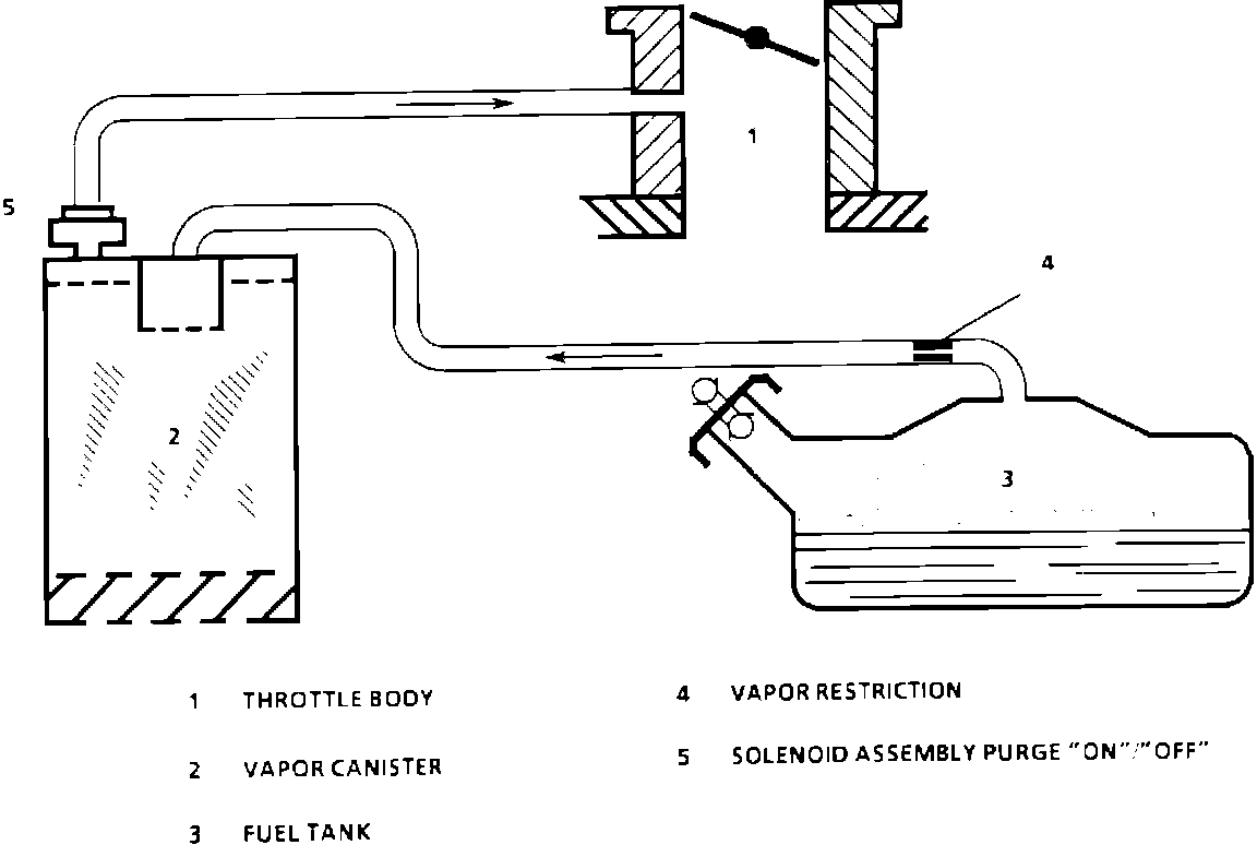 The basic Evaporative Emission (EVAP) control system used on this vehicle is the charcoal canister storage method. This method transfers fuel vapor from the fuel tank to an activated carbon storage canister. This retains the fuel vapors when the vehicle is not operating. When the engine is running, the fuel vapor is purged from the carbon element by intake air flow and consumed in the normal combustion process.