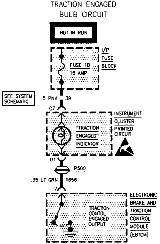 When the EBTCM is operating in the traction control mode, the EBTCM's traction control engaged output (terminal 7) closes, grounding either the instrument cluster's DIC traction control engaged input or the traction control switch LED. The EBTCM grounds this terminal to alert the driver that the traction control system (TCS) is operating.