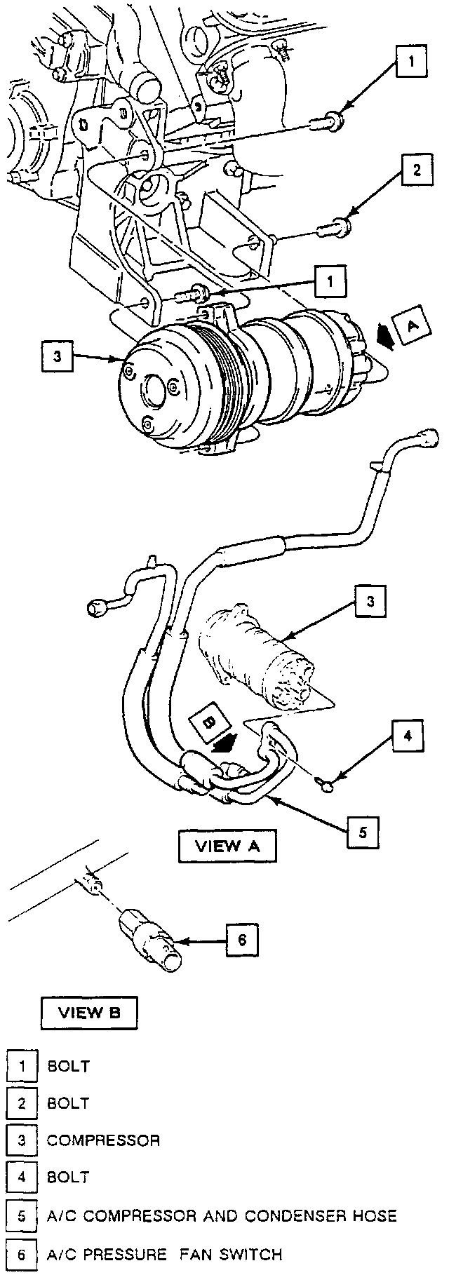 5. Bolt attaching A/C compressor and condenser hose to rear of A/C compressor.